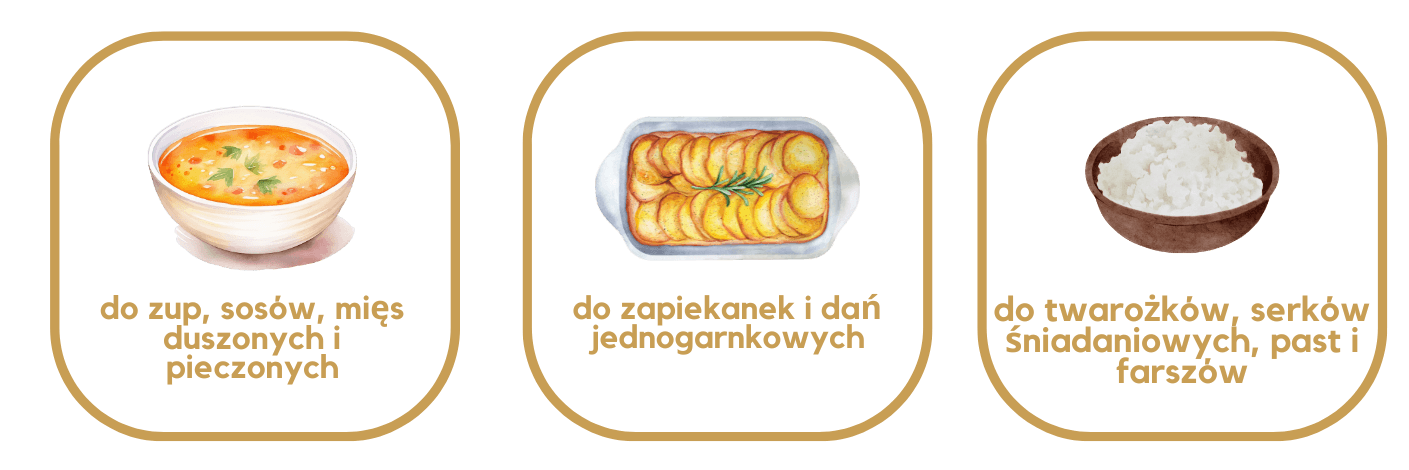 Zastosowanie: do zup, sosów, mięs, zapiekanek, serków śniadaniowych, past, marynat i dań jednogarnkowych.