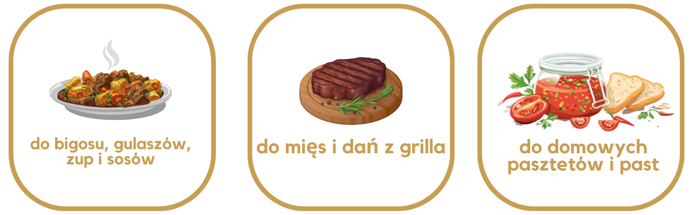 Zastosowanie: do dań mięsnych, zup (zwłaszcza fasolowej, grochowej), bigosu, sosów, potraw strączkowych i zapiekanek.