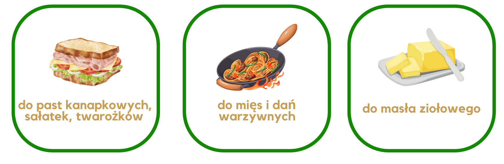 Zastosowanie: do past kanapkowych, sałatek, twarożku, masła ziołowego, zup, sosów, dań warzywnych i mięsnych, kiełbas i pieczeni
