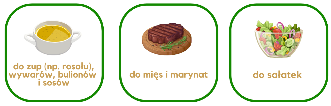 Zastosowanie: do rosołu, zup warzywnych i flaków, sosów, pieczonych mięs, sałatek i dań jednogarnkowych.