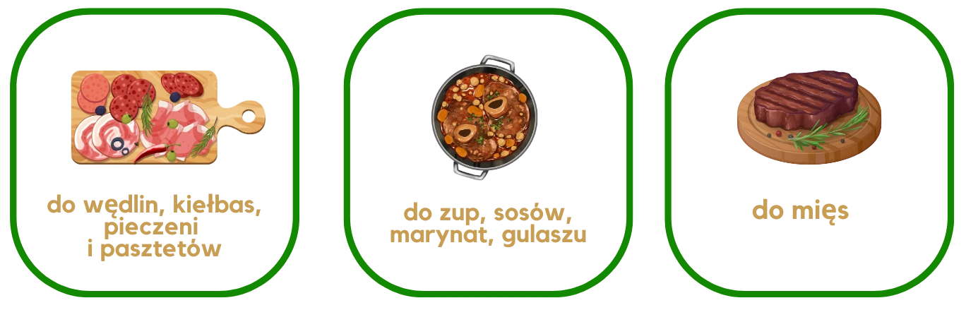 Zastosowanie: do dań mięsnych, zup, pasztetów, gulaszów, kiełbas, pieczeni, bigosu i warzyw