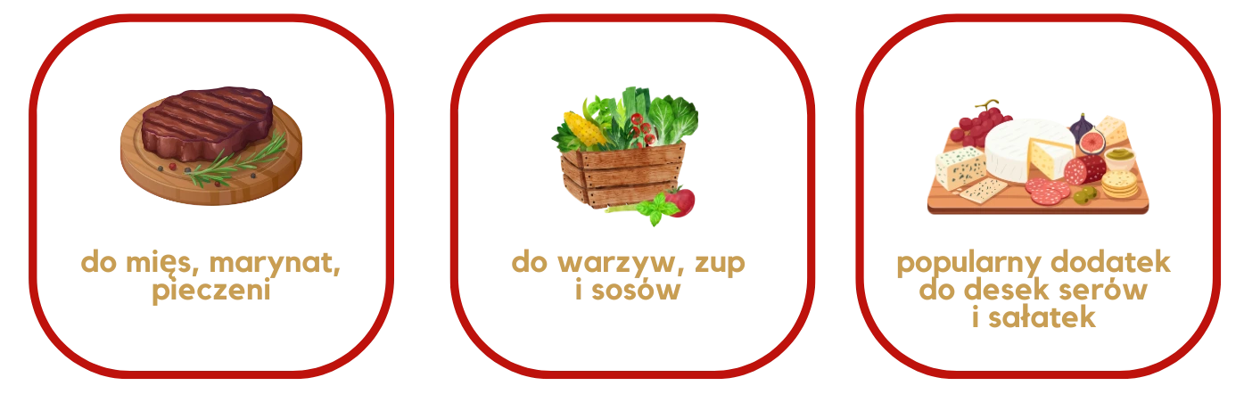 Zastosowanie: do mięs, marynat, sosów, sałatek, serów, zup, pieczonych warzyw i dekoracji dań