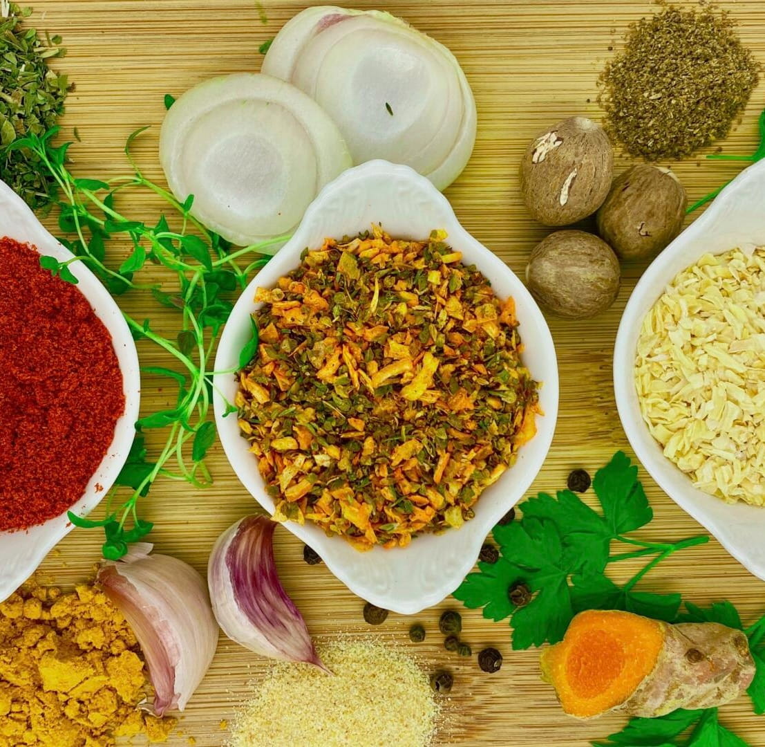 Składniki: cebula, sól, oregano, czosnek, tymianek, papryka słodka, majeranek, kurkuma, gałka muszkatołowa, pieprz czarny, kolendra, lubczyk, regulator kwasowości: kwas cytrynowy, naturalny ekstrakt papryki