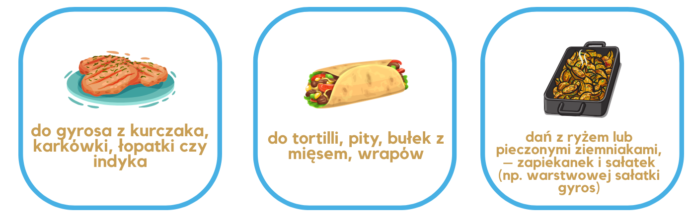 Zastosowanie: do przyprawiania mięsa na gyrosa, szczególnie kurczaka i wieprzowiny – idealna również do domowych kebabów, zapiekanek i sałatek.