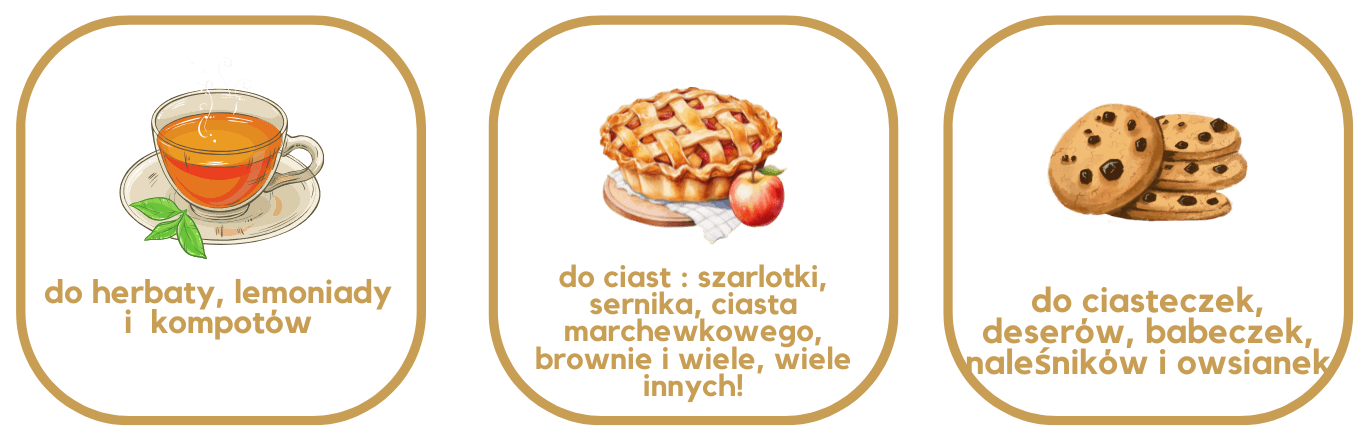 Doskonale komponuje się z każdym rodzajem herbaty – zarówno klasyczną czarną, zieloną, jak i białą, ale także z herbatą mrożoną, lemoniadą czy kompotami.