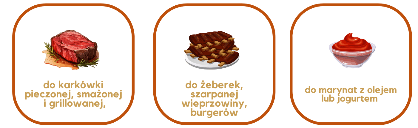W składzie znajdziesz paprykę słodką i wędzoną, cebulę, kolendrę, tymianek, lubczyk i chili – wszystko po to, by uzyskać zbalansowany smak: lekko słodki, lekko dymny, ale zawsze apetyczny. Wystarczy natrzeć mięso i gotowe.