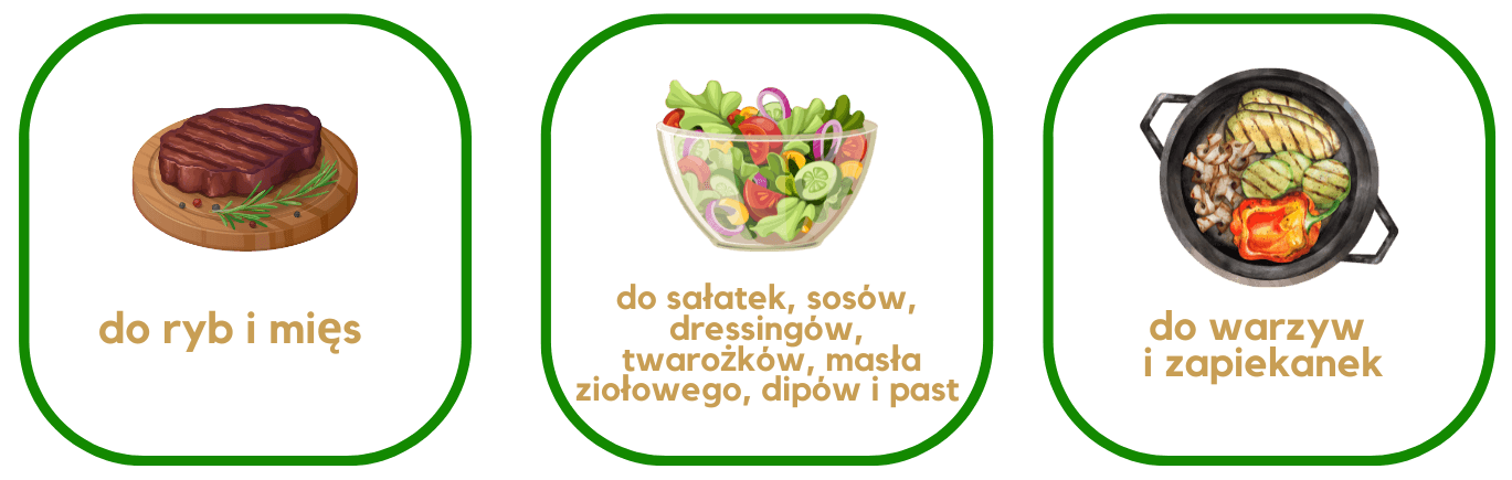 Zastosowanie: do mięs, ryb, sałatek, twarogów, dipów, pieczonych warzyw i sosów.